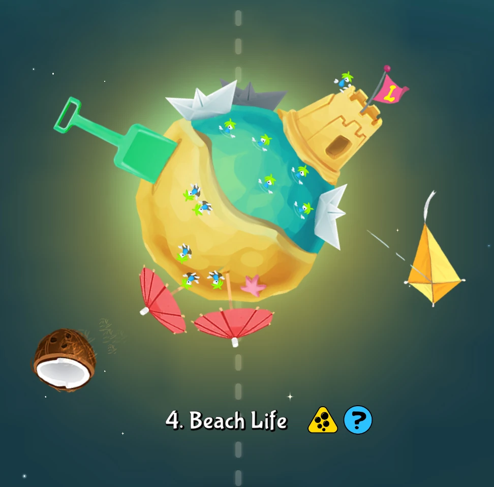 Beach Life begins as a round planet with a surface of many tan, brown, and black fragments; batches of tall, thin sticks protrude from three areas of its surface, while a coconut and many small tan rocks float around it. Once the first Mission is done, a body of water is added to its side along with a coral pink sand castle bucket, smoothing over the surface immediately surrounding it. Once the second Mission is done, half of the coconut is removed, revealing its white interior.
