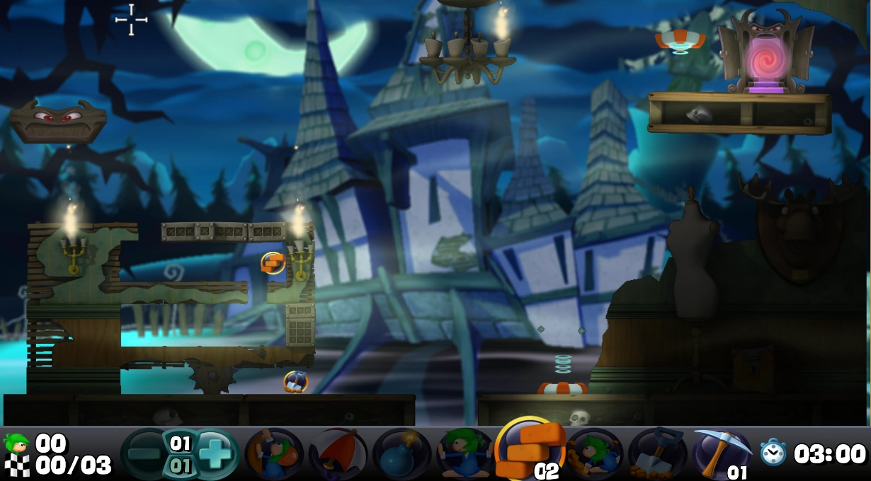 Due to a flaw in the level's design, it is possible to get the Lemmings to the Exit without using all the skills provided in the level. Instead of making the second Lemming a Builder to reach the Builder Collectible, let it fall into the bottom floor along with the first Lemming. The remaining Builder skill can still be used to build over the pit in the floor. Assign the Miner skill to one of the two Lemmings in the bottom floor, and they will walk to the Exit as usual. The Digger skill will remain in the Ability Panel, and the Builder Collectible will remain in the level.