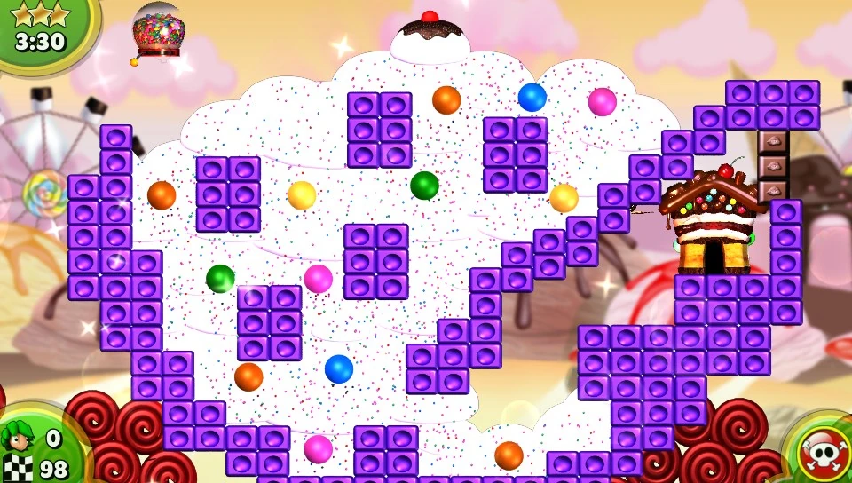 The Lemmings begin at the top left portion of a large destructible candy bowl, walking right. Assign a Digger to the first Lemming at a point where its path will fall between the two leftmost purple blocks and the two purple blocks in the middle. Once it has dug far enough so that Lemmings fall into its hole, assign a Builder to the Digger to stop it and allow the other Lemmings to fall into the hole. Set the release rate to its maximum setting to quickly get all Lemmings into the hole.