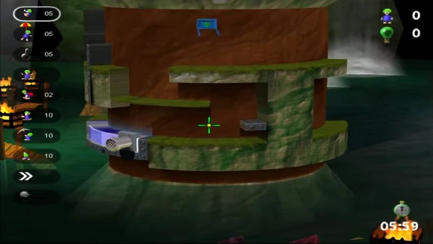 Turn the first lemming into a Miner so that when he breaches the thinner terrain, the lemmings will land on the steel plate sticking out below. The second and third lemmings will reach the end of his tunnel and turn left so make them both Climbers. When the other lemmings reach ground level, two lemmings walking closely to each other will start heading towards a water tank. Have them both mine into the steel wall to prevent casualties.