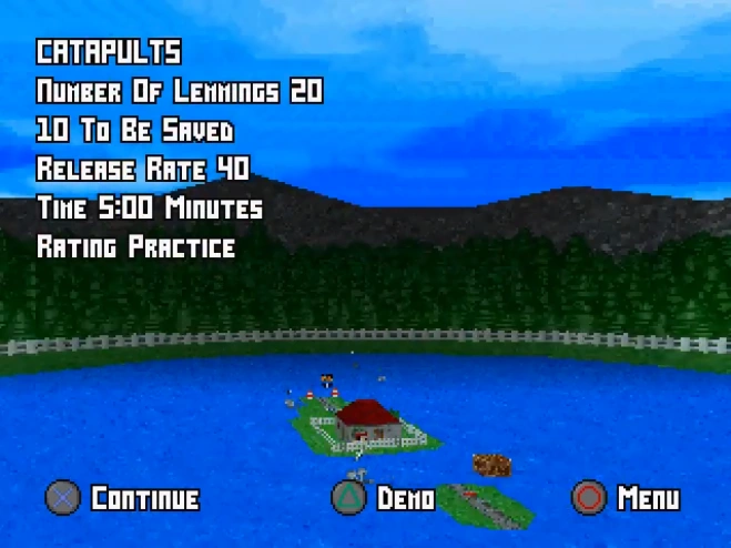 Catapults (named Spring in the Practice level menu) is the 18th Practice level in 3D Lemmings. It demonstrates players how springs work.