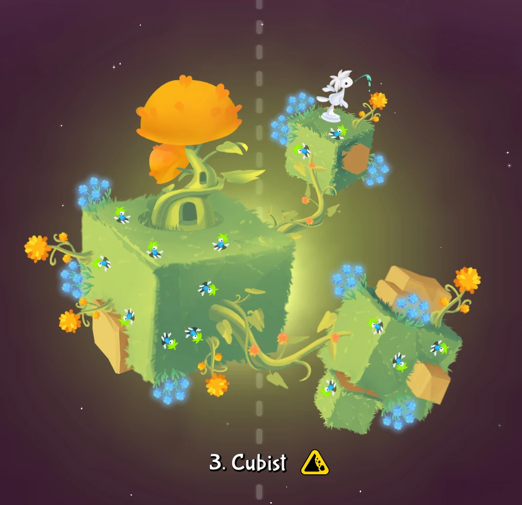 Cubist initially appears as a collection of several tan chunks of rock and small black particles surrounding a brown, teardrop-shaped seed and a yellow light. Once the first Mission is completed, this seed splits in half to reveal a green sprout with two leaves. After the second Mission is completed, the four leftmost chunks, along with the plant, combine to form a tan cube with a smaller cube embedded at its edge. After the third Mission is completed, the remaining four chunks combine in pairs to form two smaller clusters of cubes, while the main cube sprouts a pair of green vines with orange flowers; more Lemmings appear on its surface. Green grass spreads across the main cube's surface once the fourth Mission is complete, as do larger orange and azure flowers. After the fifth Mission is completed, the main cube's vines grow, connecting it to the two smaller cubes and spreading its growth onto their surfaces. When the final Mission is done, a thick green vine with a door-shaped hole and an orange cap grows on the main cube, while a gray Lemming statue is built on the upper small cube.