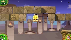 Assign Floaters to each Lemming. Assign a Blocker to the first Lemming to turn both others around. Assign a Builder to the second Lemming when it is near the floor's edge. Assign a Builder to the third Lemming to stall it. Assign a Blocker to the second Lemming when it walks to the broken pillar's top.