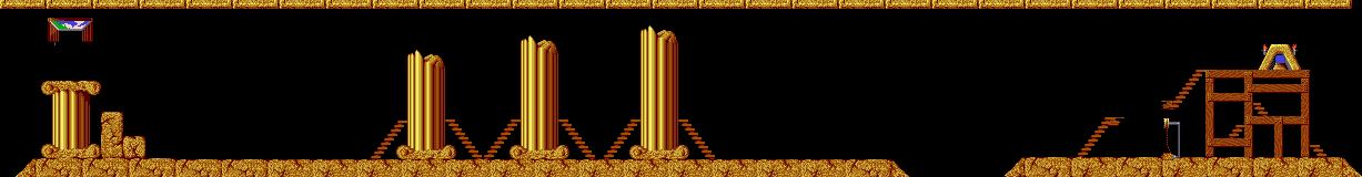 Assign a Climber and a Floater to the first Lemming who comes out, and let it scale all three pillars. Set the release rate to its maximum setting. Once it does, assign a Miner to any other Lemming who is facing right and is beside the stairs. Once this Miner is beneath the pillars, assign a Basher to it.