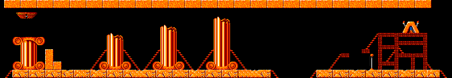 Once the Basher has cleared all pillars and their stairs, assign a Builder to it to make it stop bashing. It if turns around, assign a Builder to it again underneath the pillar so that it turns back. Assign a Builder to the Lemming at the edge of the floor; repeat this for the next three times it runs out of stairs. Once it comes across, assign an Exploder to the Blocker. Assign a Builder to the first Lemming when it is on top of the broken stairs. Once it is done, the other Lemmings will catch up.