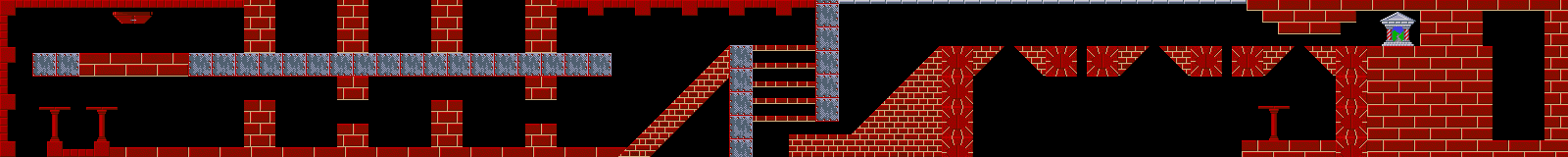 After the Lemming turns around at the wall and is heading right, turn it into a Miner so that he lands safely on the second platform from the left. When it heads back to the right, have it bash through the pillar and make it a Climber to get over the four obstacles. Have it dig through the five platforms, always making sure he is heading right.