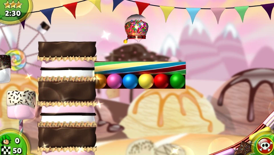 Meanwhile, the Floater will walk along an upward ramp connected to the second lower floor, then fall down onto a candy pile. Assign a Builder to the Floater as soon as it turns left. It will run into a thin candy cane pole and turn around. Assign a Basher to the Floater once it returns to this pole. All Lemmings will enter the room behind this pole and reach the Exit.
