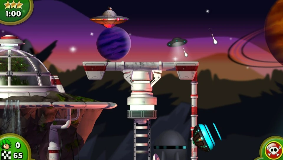 The Lemmings rapidly spawn, walking towards a Trampoline over an acid pool. At the opposite side, there are four vertically stacked rooms: three of them each containing a switch, and one at the top leading to the Exit but guarded by three doors. The Trampoline must be aimed so that each bottom floor receives a Lemming, while the remaining Lemmings can reach the Exit. Start by positioning the Trampoline slightly above a directly right-facing position (aiming it towards the bottommost floor), then slowly move it upward after the first Lemming lands on it. Once all three switches receive a Lemming, aim the Trampoline at a position slightly higher than northeast. Press each switch's button to open each door.