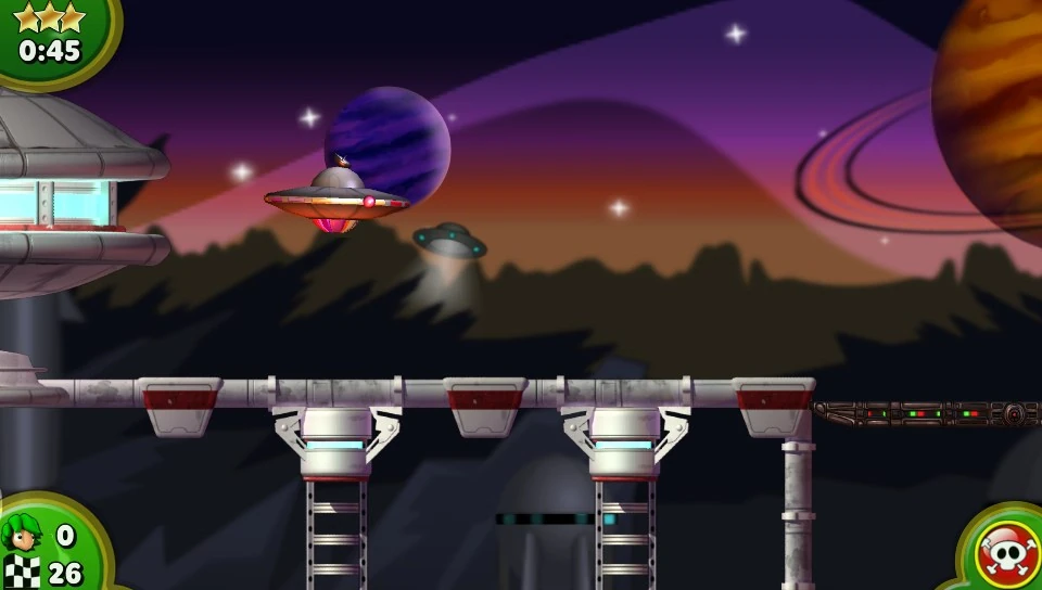 The Lemmings start atop a box, walking right towards the slidable platform next to the edge of the box. Zoom out to see both the box and the platform at the right of the level, which has the Exit. As soon as the last Lemming falls onto the slidable, quickly drag the slidable so that it is adjacent to the platform at the right. If no Lemmings fall off of the slidable while it is moving, they will all be able to walk to the Exit. No skills provided in the level need to be used.