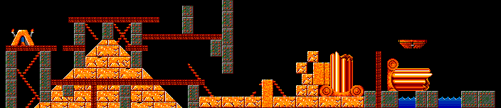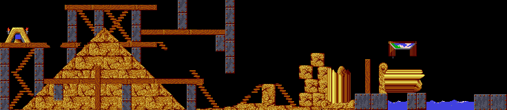Turn the first Lemming into a Blocker to stop the others from falling into the water. The others should bash through the the obstacles to the left, up to and including the broken stairs. After that last one, they must build to reach the long, horizontal beam in the middle of the pyramid. Bash through the pyramid then then build in a zigzag pattern to reach the exit.